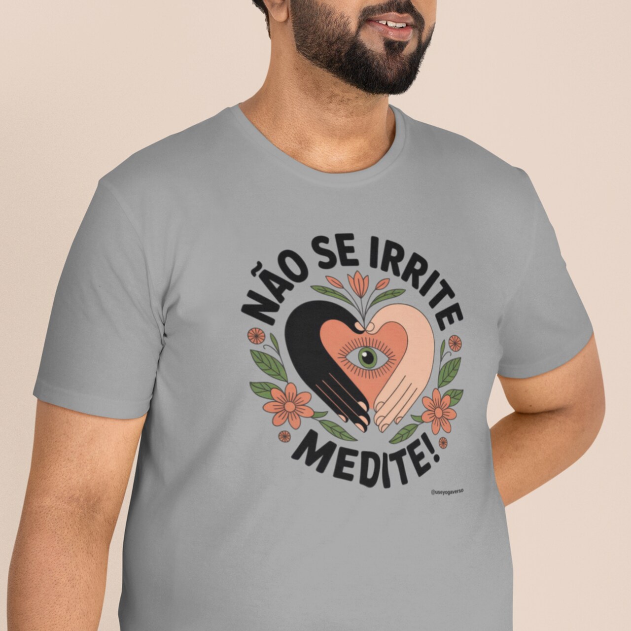 A estampa exclusiva revela um coração radiante em tons calorosos de rosa e laranja, envolvido por mãos amorosas em posição de mudra, simbolizando o cuidado gentil que oferecemos ao nosso centro emocional através da prática meditativa. Flores delicadas e elementos cósmicos dançam ao redor, representando o jardim que floresce quando cultivamos a tranquilidade interior e a autoaceitação.