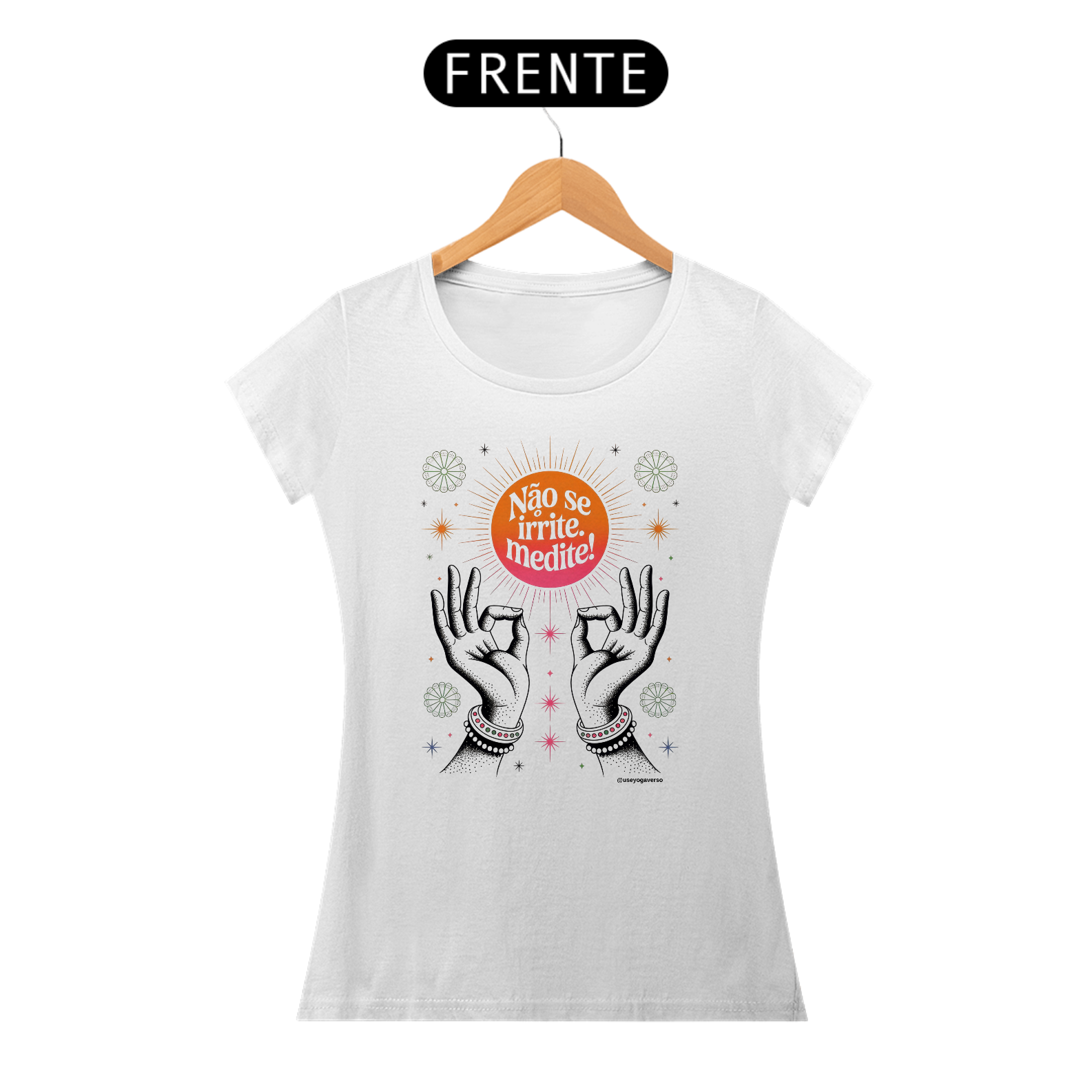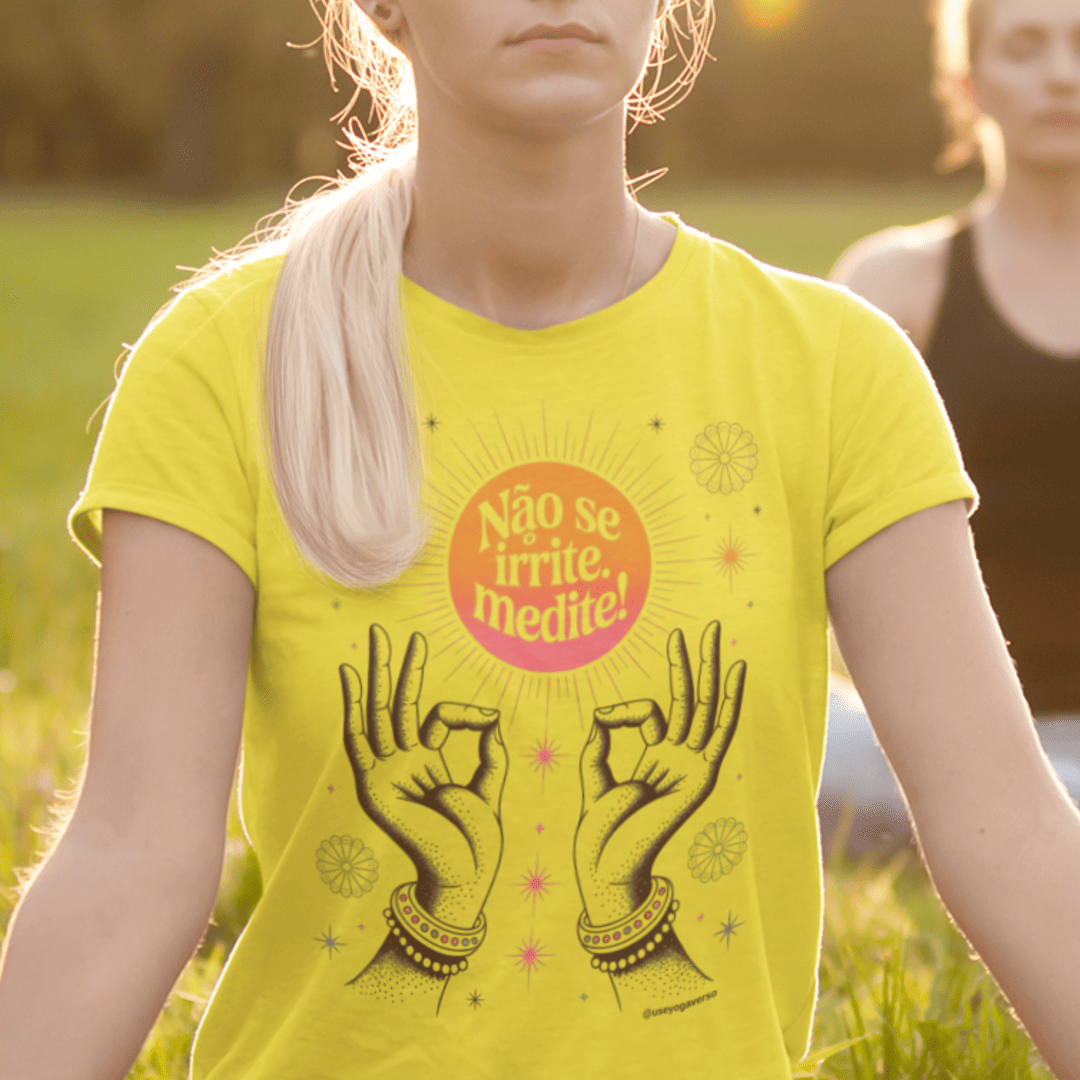 Com a mensagem "Não se irrite. Medite!", esta estampa encantadora apresenta um sol radiante e mãos em mudra, simbolizando iluminação e conexão interior.