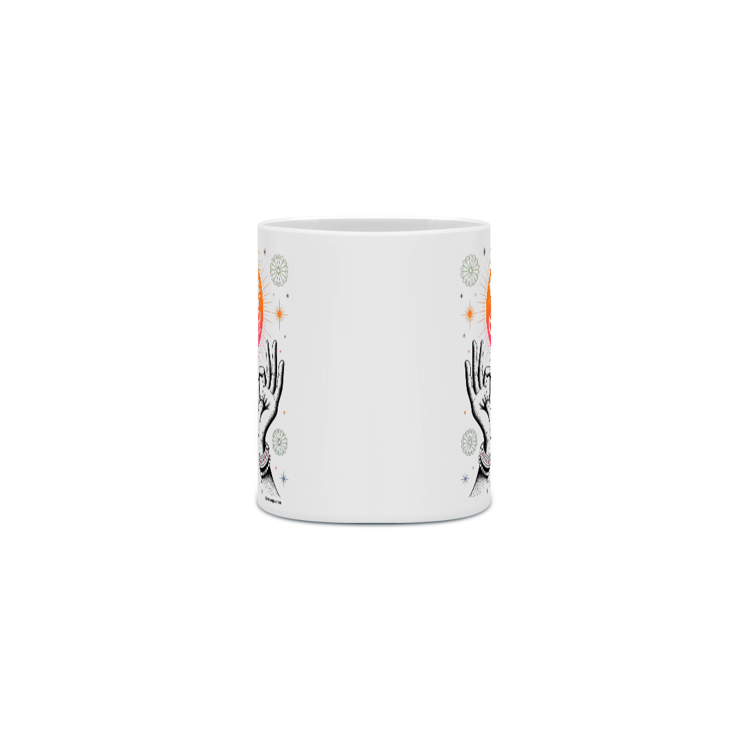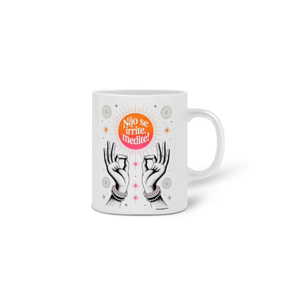 Comece seu dia com um lembrete de calma e intenção com a Caneca "Yoga Serenidade Solar". Com a mensagem "Não se irrite. Medite!", esta estampa vibrante com o sol radiante e mãos em mudra é a companhia perfeita para seus rituais diários de yoga e meditação. Ideal para o chá matinal, café ou qualquer bebida que te convide a pausar, respirar e encontrar seu centro através da prática do yoga.