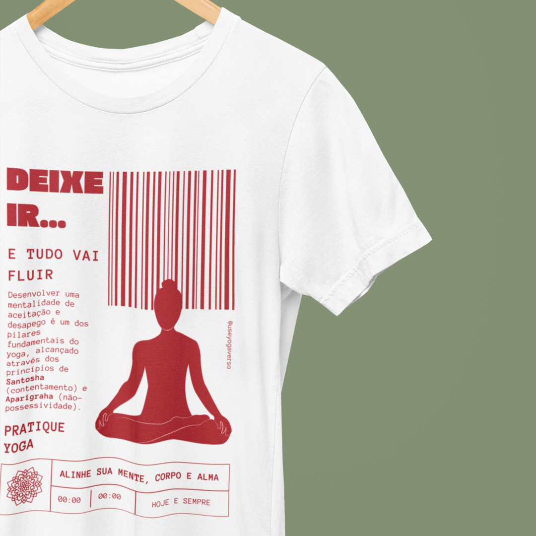 Conecte-se com a essência da leveza e serenidade com a nossa estampa exclusiva "Deixe Ir, Flua". Inspirada nos ensinamentos do yoga, essa camiseta traz o mantra “Deixe ir, e tudo vai fluir”, um poderoso lembrete de que, ao desapegar do que não nos serve mais, abrimos espaço para que a vida siga seu curso natural, promovendo transformação e equilíbrio interior.