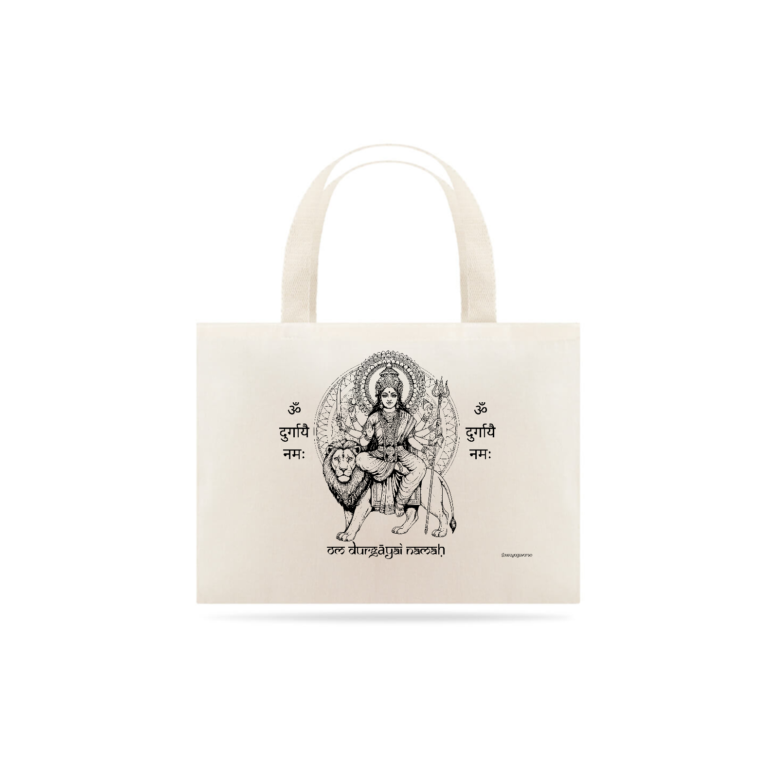Inspirada na Deusa Durga, símbolo de coragem e proteção, esta bolsa traz estampado o mantra “Om Durgayai Namah”, que significa “saudações à Mãe Divina Durga, fonte de força e confiança”.